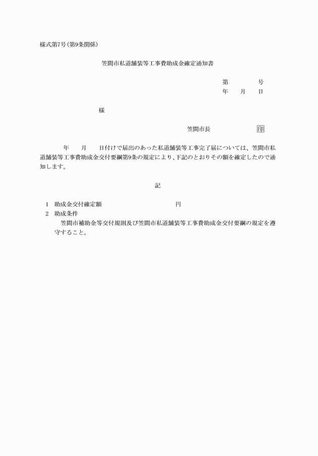 第10条 助成金の交付確定を受けた者(以下「事業完了者」という。)は、助成金の交付を請求する場合は、笠間市私道舗装等工事費助成金交付請求書(様式第8号)を市長に提出しなければならない。