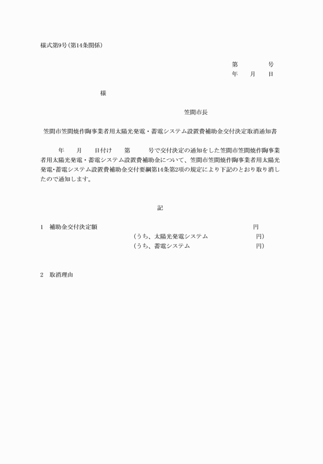 第9条 補助事業者は、補助金の交付申請の内容を変更しようとするとき、又は補助事業を中止しようとするときは、笠間市笠間焼作陶事業者用太陽光発電・蓄電システム設置費補助変更等承認申請書(様式第4号)を市長に提出し、その承認を受けなければならない。ただし、交付決定の額に変更が生じない事業費の変更は除くものとする。