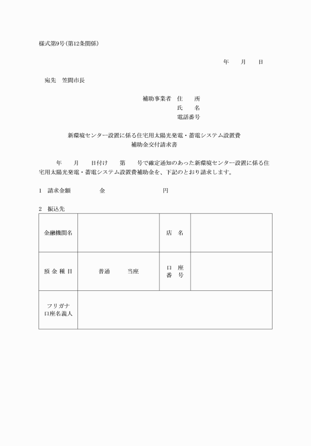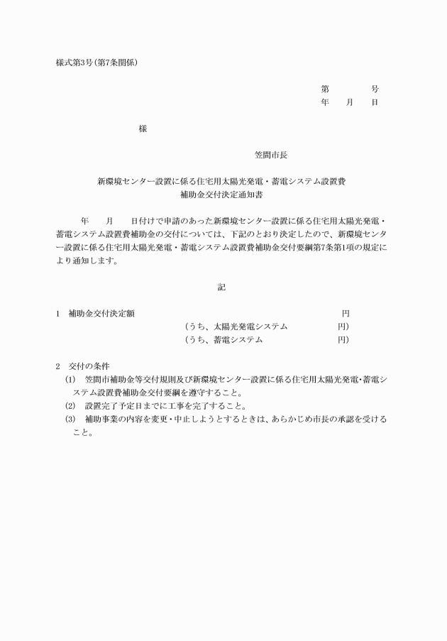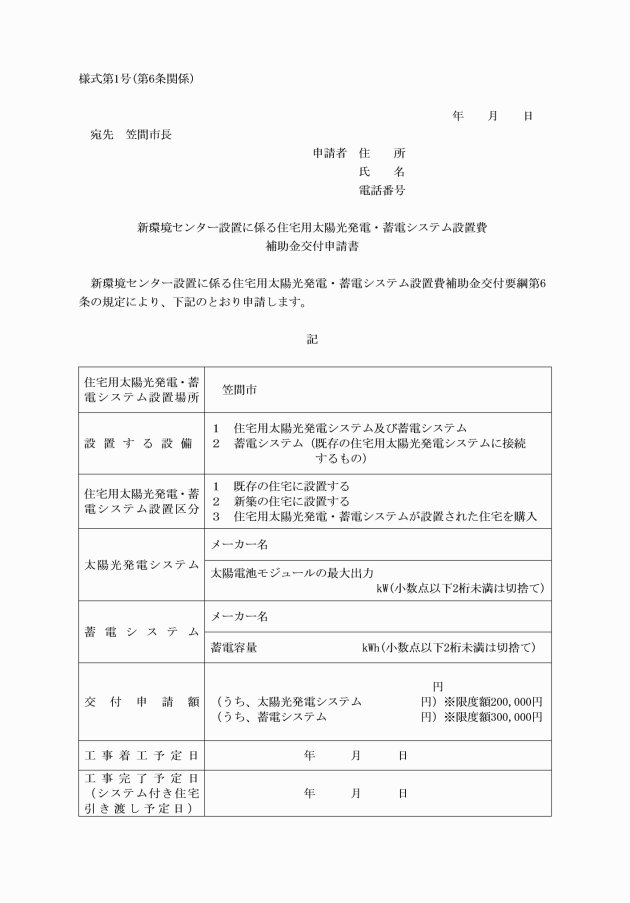 第6条 補助金の交付を受けようとする者(以下「申請者」という。)は、太陽光発電システム及び蓄電システム設置工事若しくは蓄電システム設置工事の着工前又はシステム付き住宅を購入する場合は購入前かつ当該年度の12月末日までに、新環境センター設置に係る住宅用太陽光発電・蓄電システム設置費補助金交付申請書(様式第1号)に次に掲げる書類を添えて、市長に提出しなければならない。